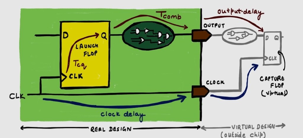 The register launches data to go to a capture flop, outside the real design through an ‘output port’. The time taken from output port to reach the virtual capture flop is Toutput_delay.