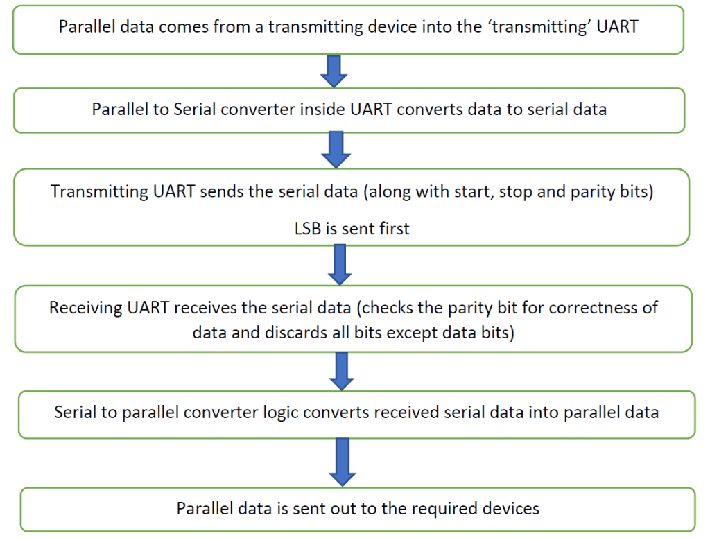 | to convert incoming parallel data to serial outbound data – Transmitting UART | to convert incoming serial data to outbound parallel data – receiving UART | to introduce low level error checking mechanism |