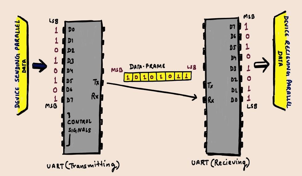 - Uses two wires to transfer data: Transmitter (Tx) and Receiver (Rx)