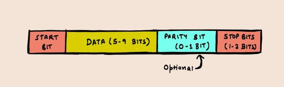 - Data is sent in the form of packets, in addition with start, stop and parity bits.